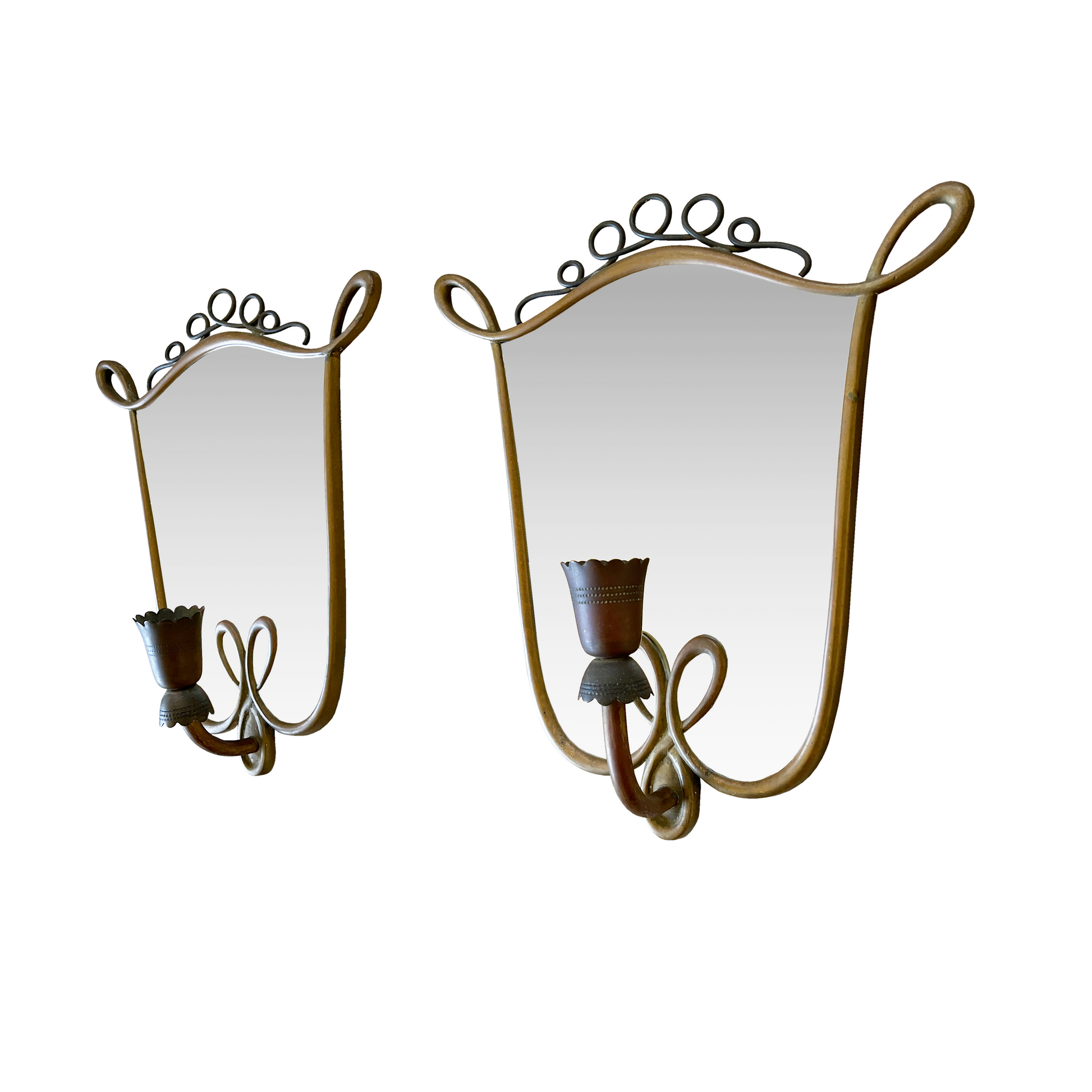 An elegant pair of vintage Italian wall sconces featuring mirrored glass encased in brass frames and distinguished by looped accents along the top edges and center of the mirrored backplate. The design is completed with a double loop detail at the base. A curved arm resembles a delicate bud to hold the lamp in place, which is further enhanced by finely hand-cut scalloped edges and subtle dotted lines. The pair is beautifully patinaed.