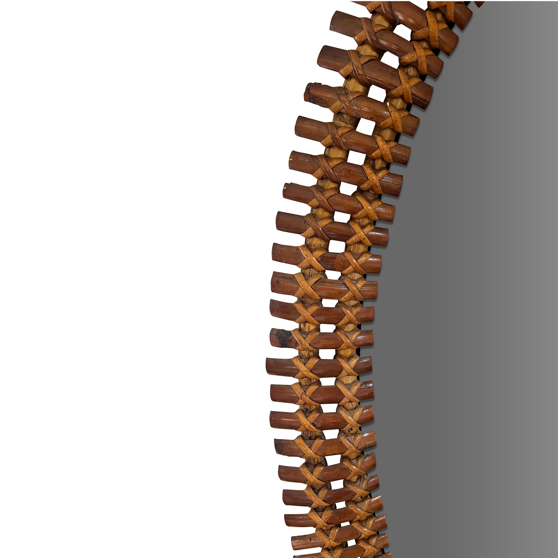 A large vintage Italian mirror by Austrian designer Olaf Von Bohr. It features a double oval outer layer of bamboo and the outer rim is decorated with large flat bamboo sticks that are secured with double cross-weaving. Made from natural bamboo it offers a striking visual aesthetic. It is a warm to dark caramel colour as pictured.