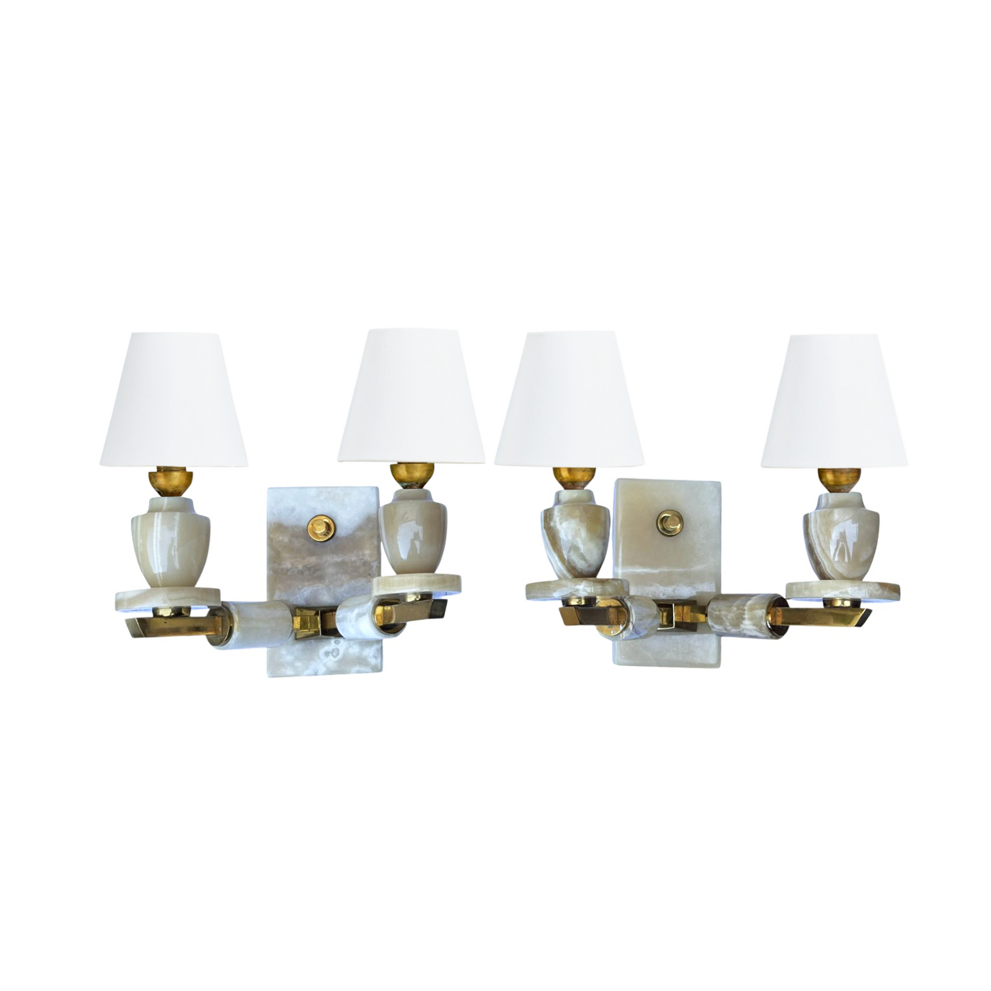 A distinguished pair of French Art Deco wall lights showcasing dual brass and pale onyx combination. The interplay between cool stone and warm metallics creates a refined aesthetic, while their exceptional provenance and well-preserved condition affirm their status as authentic vintage design pieces. Custom linen shades to be created post-purchase. Price is for the pair. Arriving January end.