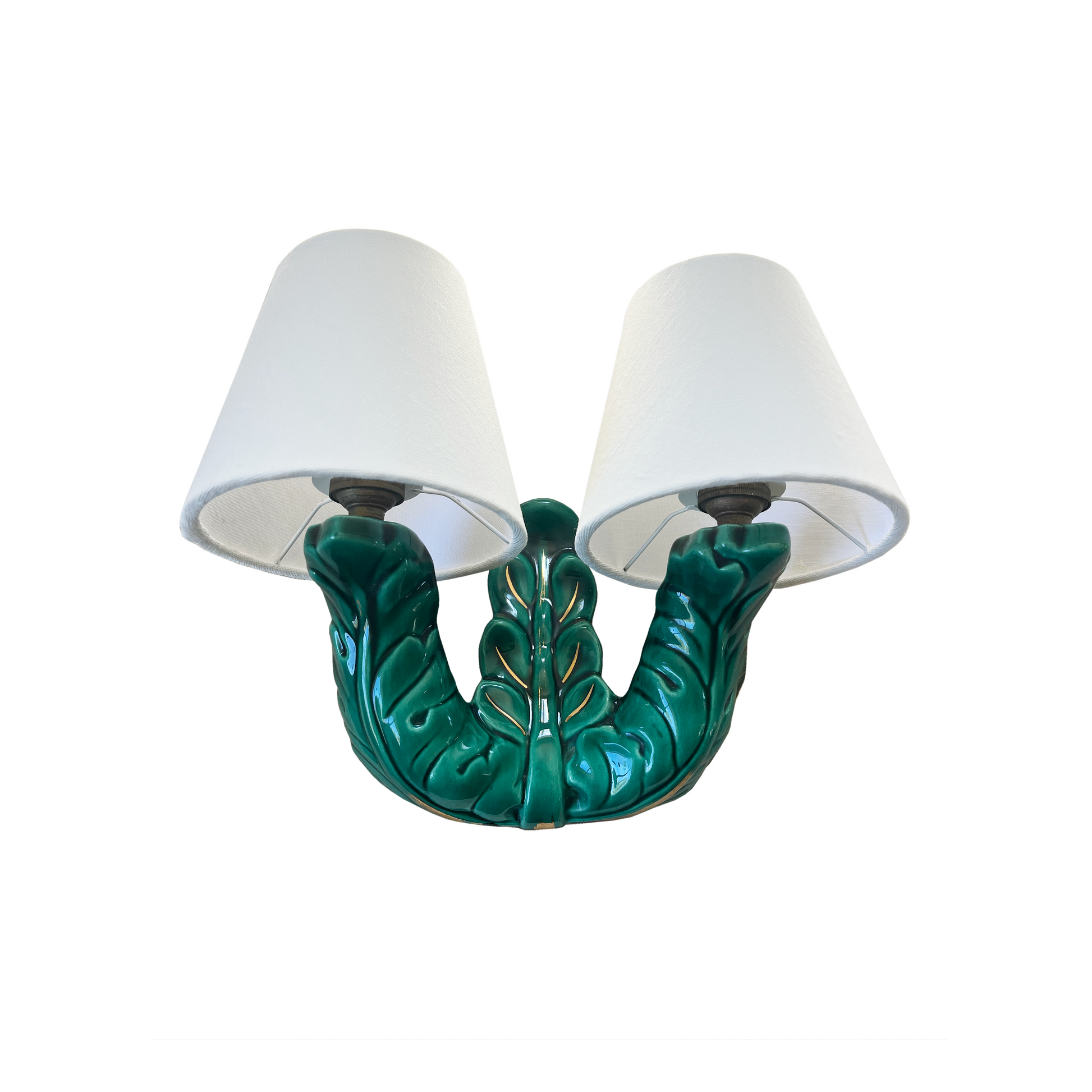 An exceptional emerald green ceramic wall light that displays a distinctive leaf-inspired motif on both arms and the central backplate. Its design is further enhanced with subtle hand-painted gold accents along its center. Linen shades included and custom-made post-purchase.
